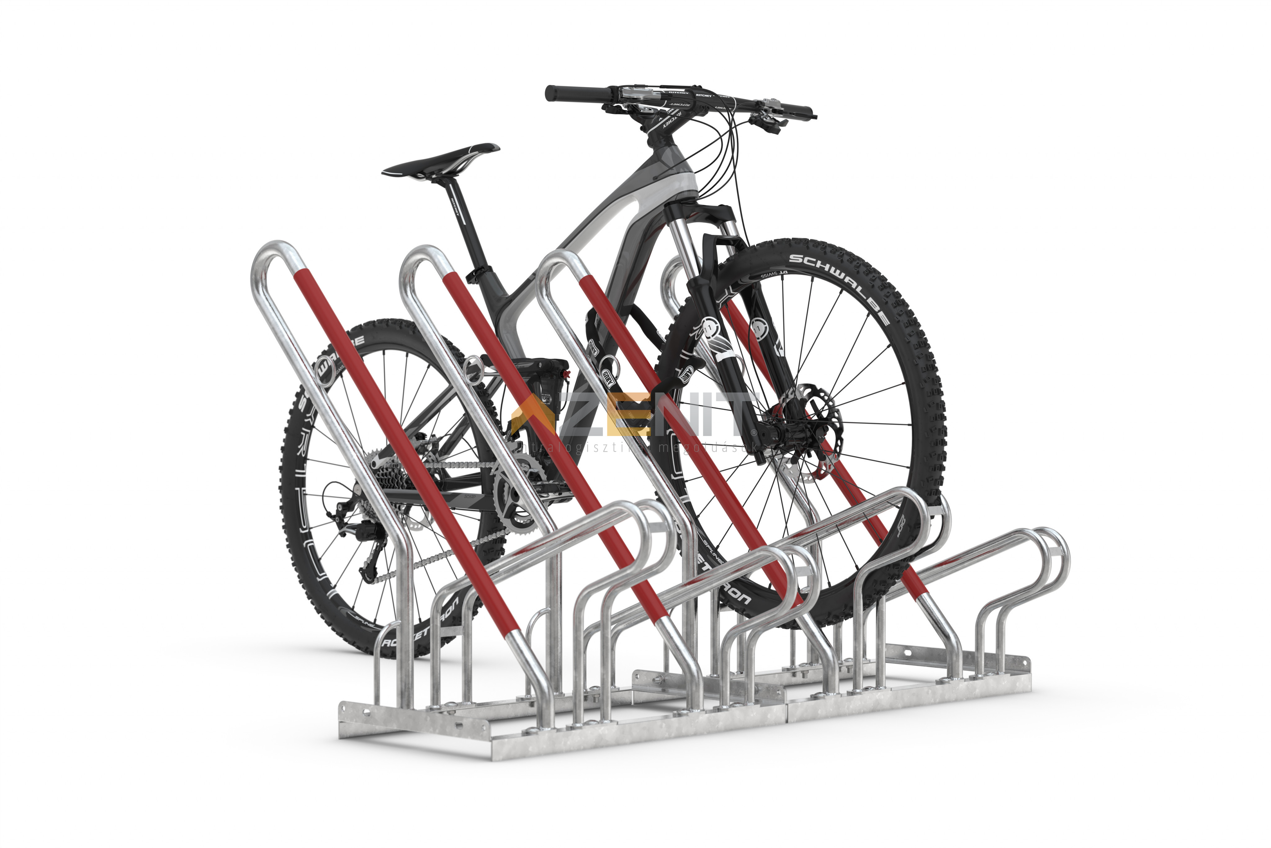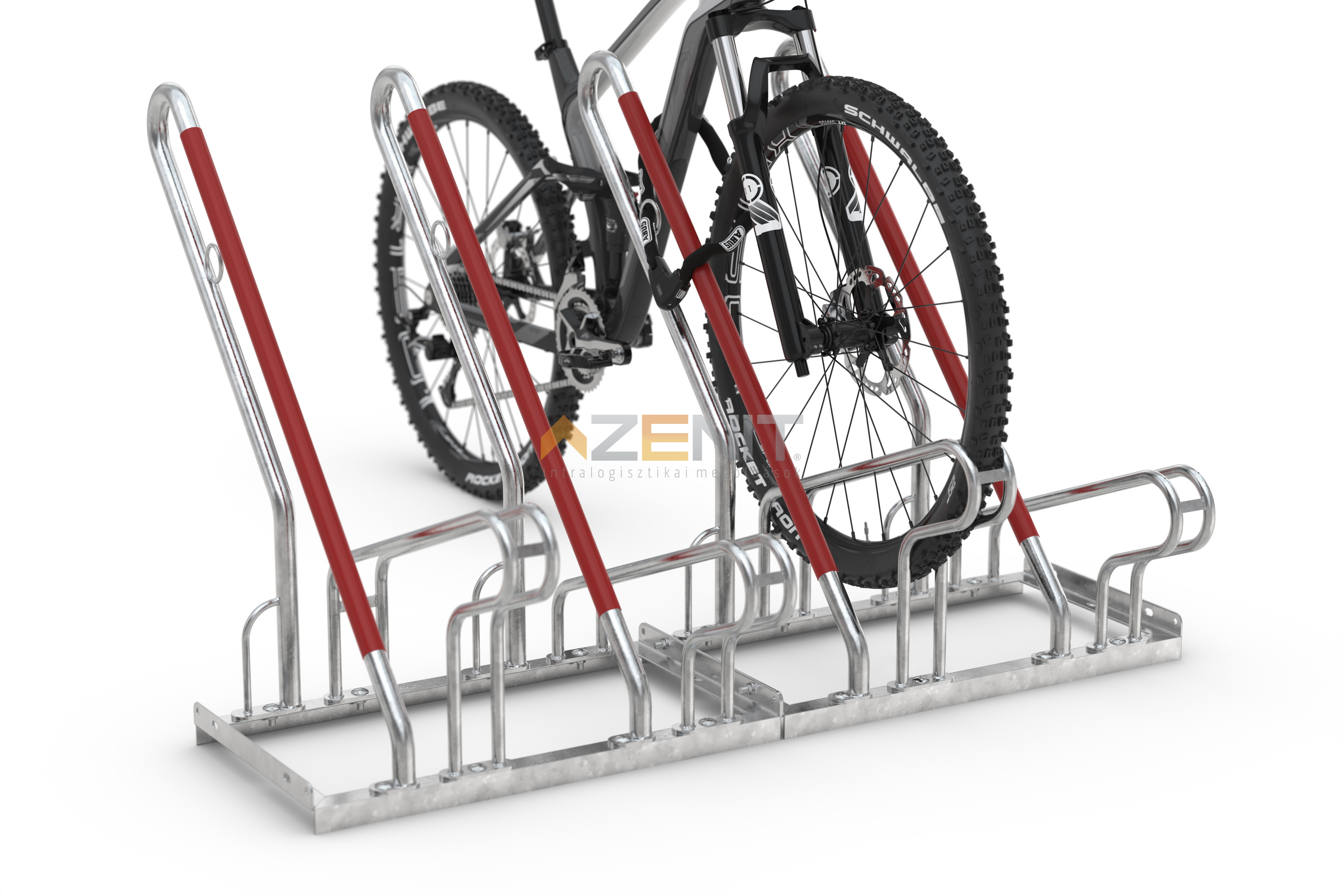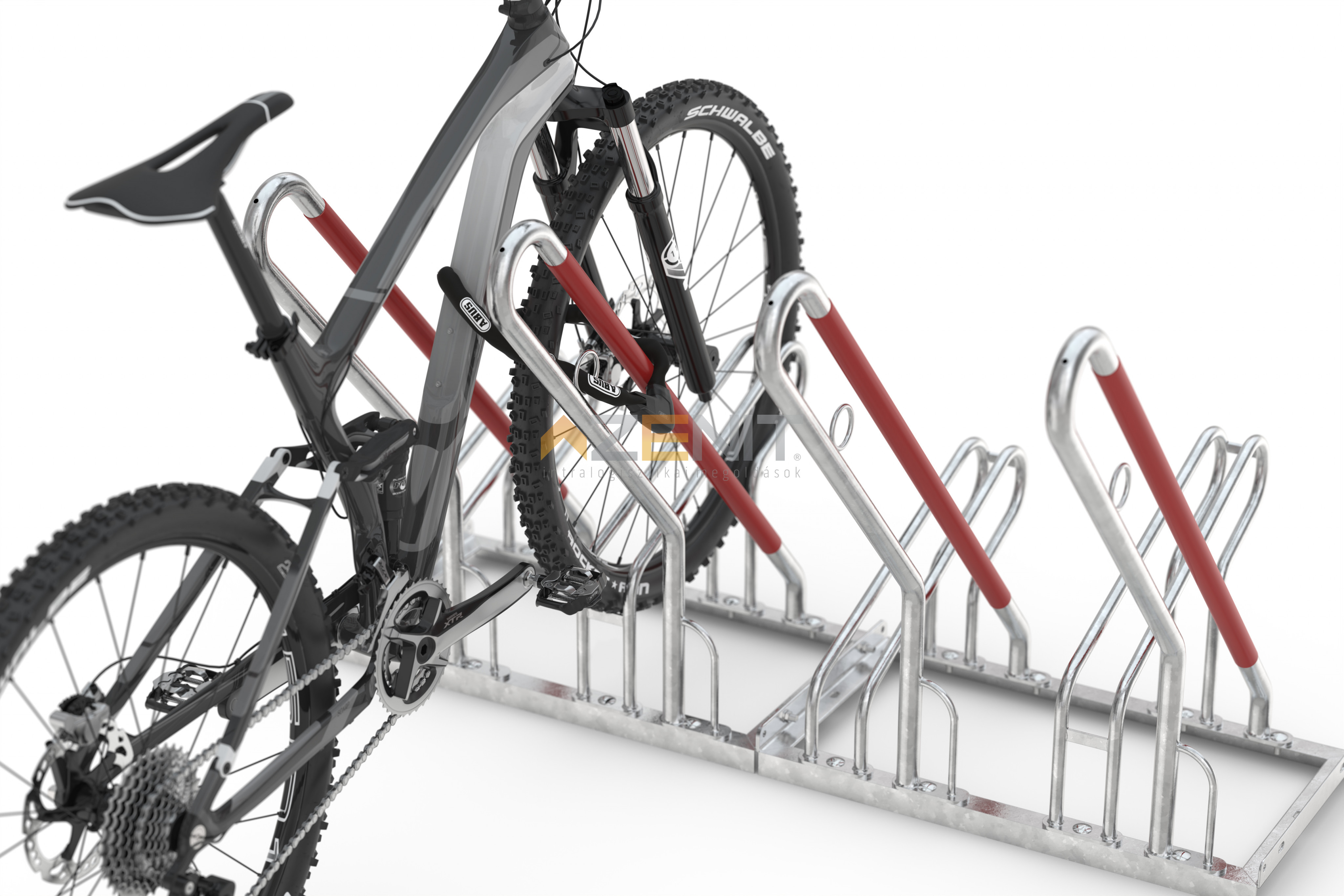 Modern kerékpártároló funkcionális támasztókonzolokkal. Itt nyugodtan leteheti a legértékesebb kerékpárját is, legyen szó akár e-bikeról, akár más bicikliről! A piros műanyagburkolat a ferde kengyelen óvja a kerékpárt a szándékos vagy véletlen feldöntéstől és az ebből fakadó sérülésektől. A kerek acélszemek a konzolokon lehetővé teszik a biciklik lakattal történő rögzítését. Padozathoz történő rögzítésre alkalmas, könnyen telepíthető, bővíthető. 2, 4 és 6 tárolóhelyes változatban.