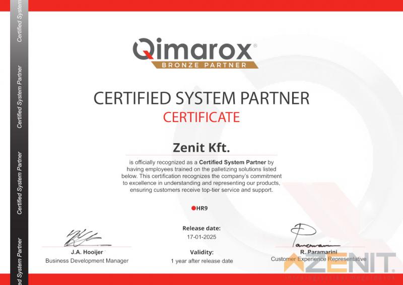 A Zenit Kft.-nél büszkék vagyunk arra, hogy cégünk hivatalos partner tanúsítványt kapott a Qimarox-tól, a palettázó modulok vezető gyártójától.
